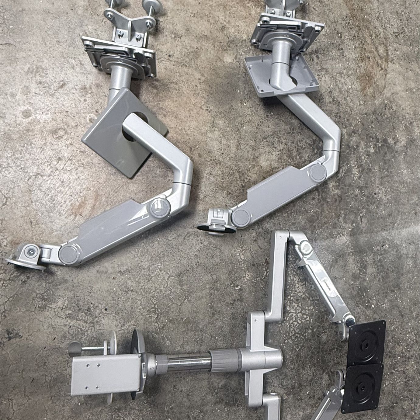 There are three monitor arms: Two single monitor arms: $30 for two or $20 each One dual monitor arm: $25 Pick up only