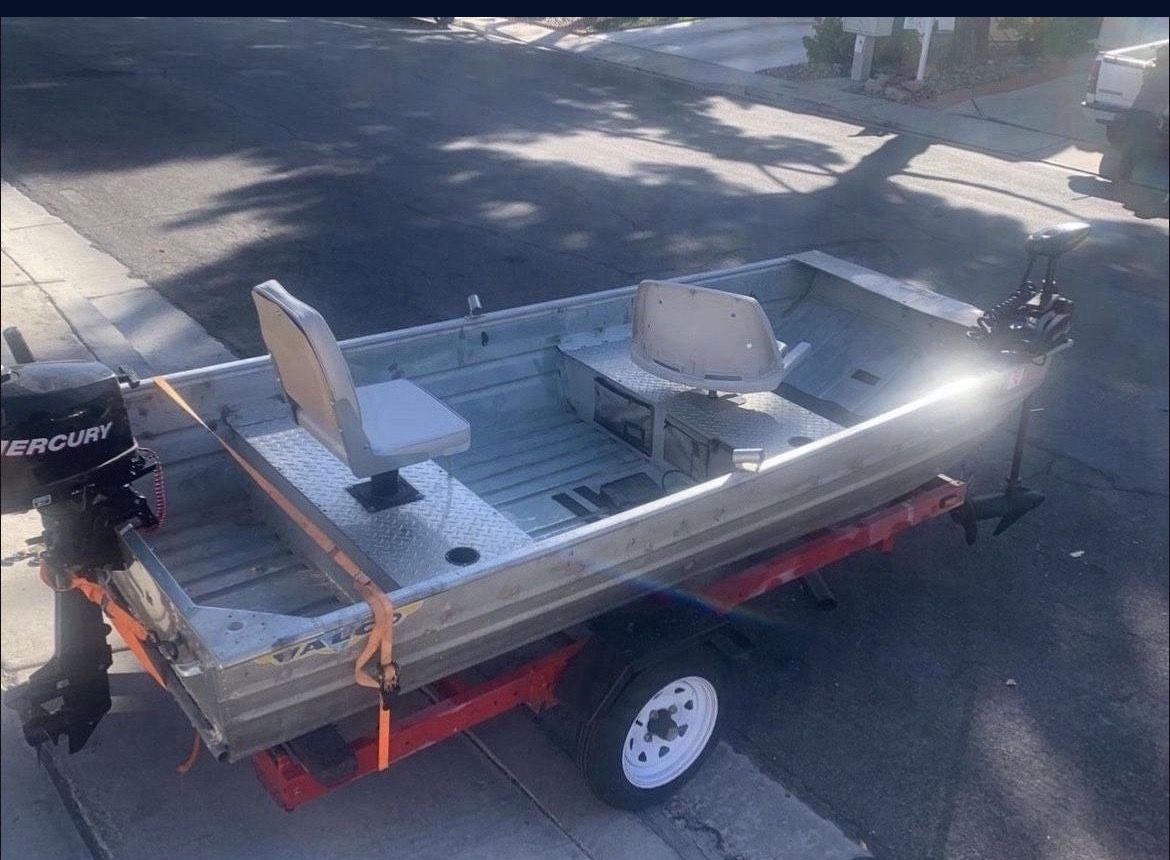 Aluminum fishing boat With motor and trolley motor Here's why You wanna buying this boat: because it's aluminum and it will last forever! Light weight to save gas Small to fit anywhere u want 4 stoke motor Adjustable tolling motor Seats in great shape, garaged stored And with this smaller boat u can get into places where other boats can't to catch a lot of fishes 10'x 4.7' Asking only $3,000 obo for everything u see Clean Nevada title for boat and trailer Hurry don't miss out !!!
