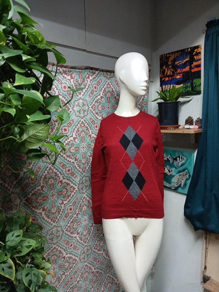 Preowned, great condition. Freshly hand washed. Dark red background with black and grey diamonds and white dotted lines on the front. Soft blend of 60% merino wool, 25% acrylic, and 15% nylon. Dry clean. Delivery or pickup. This item is cross listed on other sites, so first come, first serve. Approximate measurements with the item laying flat are as follows: Waist - 16½" (slight stretch) Pit to pit - 17" (slight stretch) Length (collar to bottom) - 20" Sleeve length - 18"