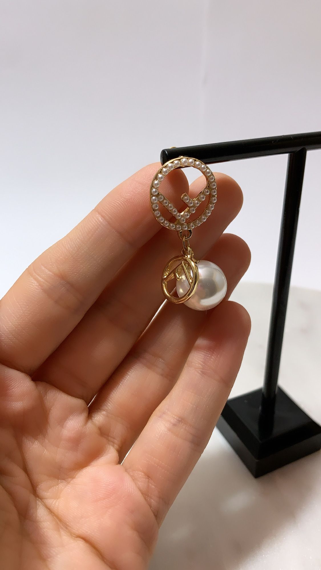 Gold Plated Full Pearl F Stick Geometric Round Pearl Earring