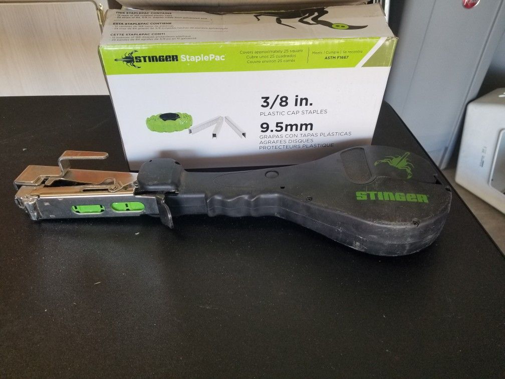 Stinger plastic cap stapler used for installing tyvek house wrap.