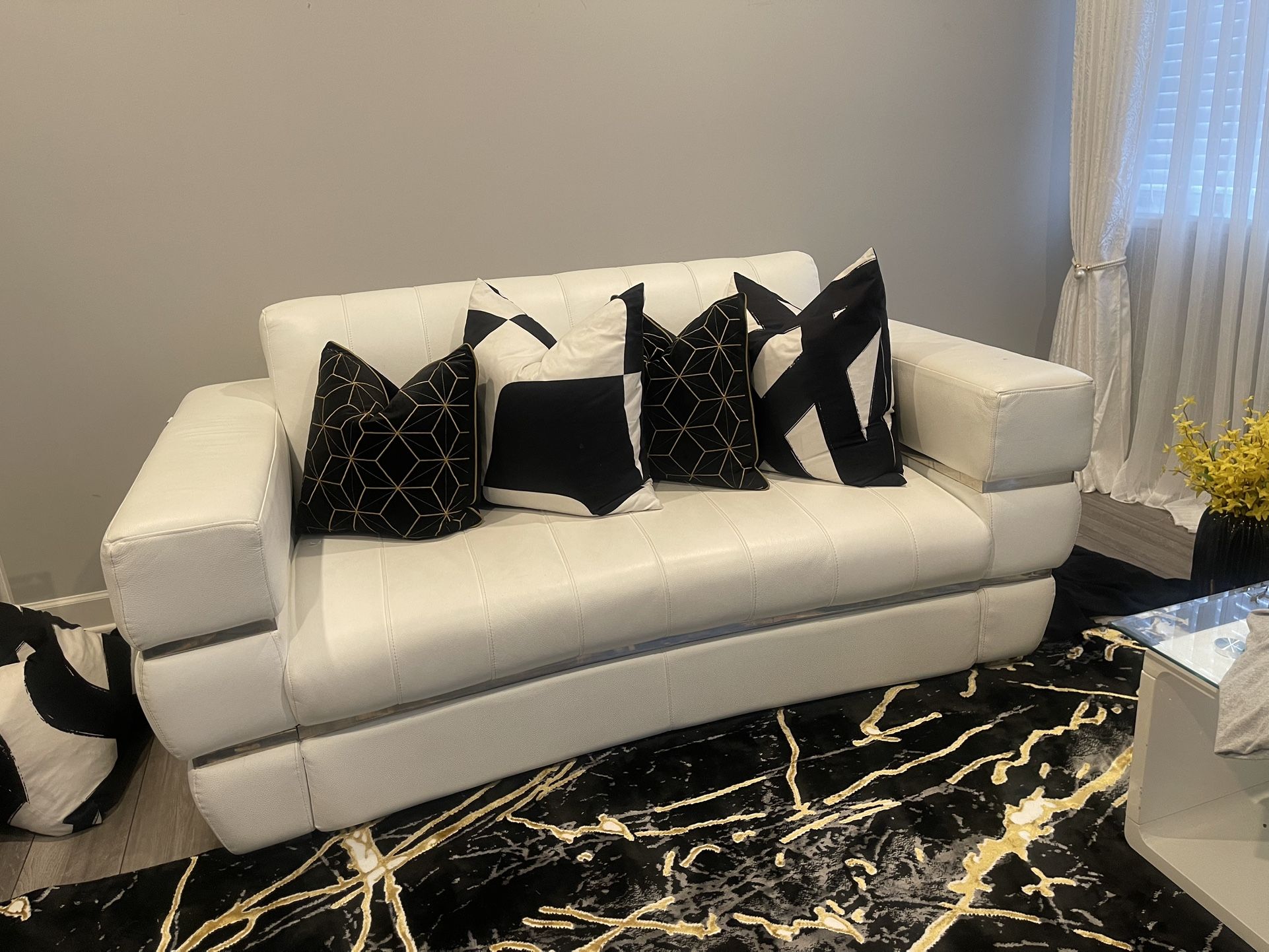Beautiful modern white sofa and loveseat set with chrome detailing. Very stylish and comfortable — perfect for living room or basement setup. Loveseat is in great condition. Sofa has a small stain (shown in photos), but overall still very nice and sturdy. From a clean, smoke-free home. Selling due to moving.