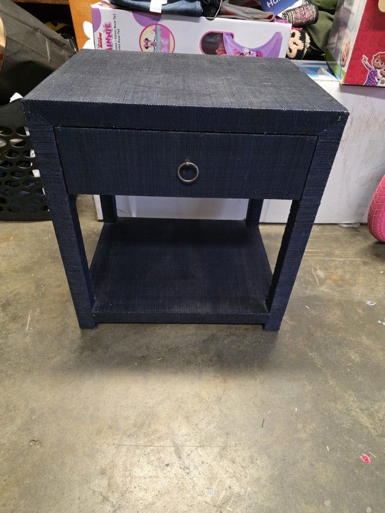 Dark blue nightstand. This has a fabric, woven type finish. It can be wiped down but could use a little of a better cleaning. Pick up in East Whittier, near La Mirada. Xposted
