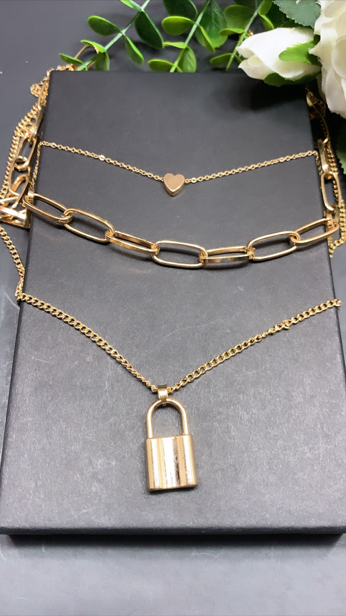 18K Gold Plated Heart Necklace Triple Layer Lover Lock Pendant, Gold Color