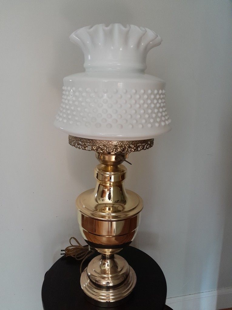 Milk glass globe. Brass base. Excellent condition.