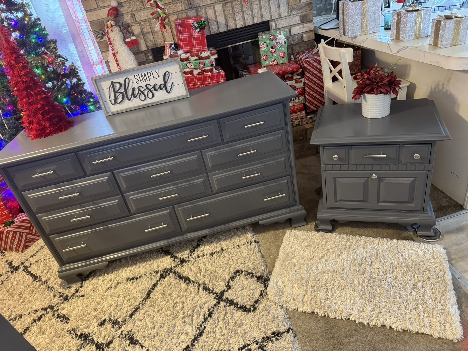 MEASUREMENTS BELOW✨✨ BEAUTIFUL GRAY REFINISHED LONG DRESSER AND MATCHING NIGHTSTAND ✨✨ SOLID WOOD!! LONG DRESSER HAS 8 DRAWERS. THE 3 MIDDLE DRAWERS ARE VERY DEEP AND HOLDS ALOT.. BOTTOM ALSO!! TOP ARE THINNER DRAWERS … GORGEOUS DRESSER.. ALL DOVETAILED DRAWERS.. NIGHTSTAND HAS ONE DRAWER AND BOTTOM COMES DOWN FOR STORAGE.. BIG SPACE.. ALL DRAWERS WORK GOOD!! NO ISSUES.. MATCHING SET! ALL NEW SILVER HANDLES AND KNOBS.. IF POSTED ITS AVAILABLE.. PICK UP IN JUSTICE IL BY 79th ROBERTS RD.. FIRST COME FIRST SERVE.. NO HOLDS WITHOUT DEPOSIT ( 1 day hold ) CASH ON ARRIVAL.. PLEASE BRING HELP IF YOU HAVE IT.. CHECK OUT MY OTHER FURNITURE LISTINGS.. DISCOUNT IF YOU BUY MORE THAN ONE.. NO REFUNDS.. MEASUREMENTS: DRESSER 33” tall 60” wide 19” deep NIGHTSTAND 24” tall 24” wide 18” deep Thanks for looking 👀