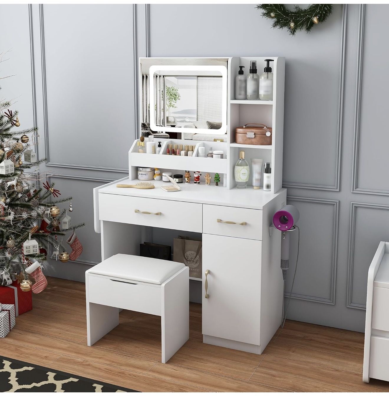 New in box Vanity Desk with LED Mirror Lights & Power Outlet Charging Station - Makeup Dressing Table with 3 Drawers, 7 Shelves, Storage Stool, and Adjustable Drop-Leaf Countertop for Women & Girls (White