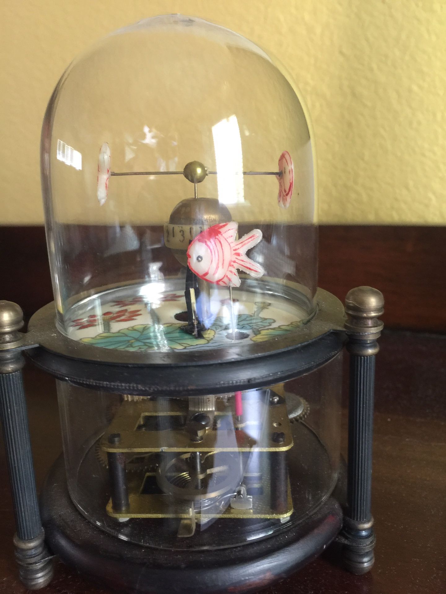 Vintage handmade machinery clock with moving two fish hands Size H 5.5” x W3.5”