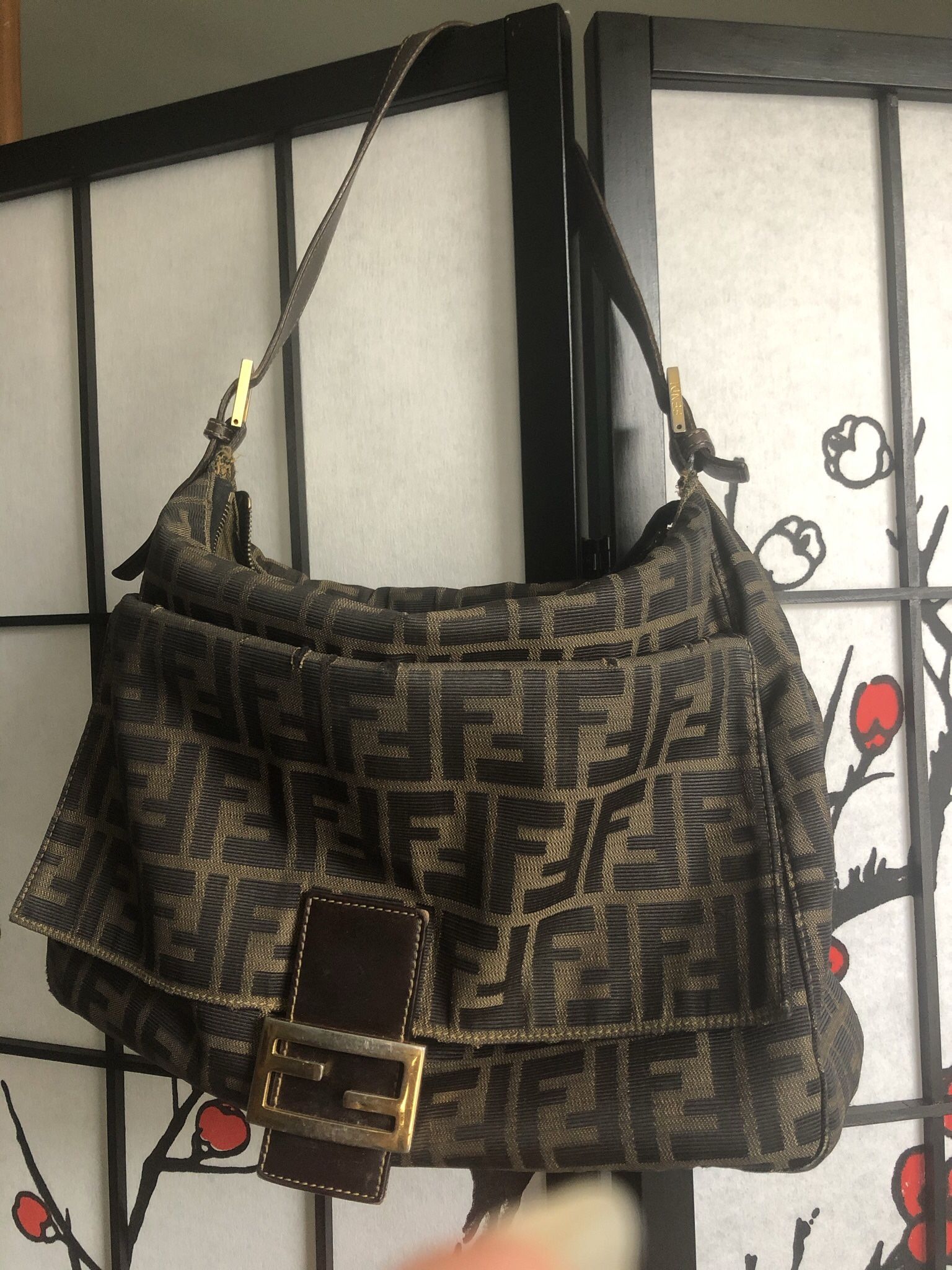 Zucca Mamma , brown , canvas , bag shoulder 12” x 9” x 5” , gold condition. , buckle ,little filed, flap ridge scuffs on , leather , minimum mark’s.