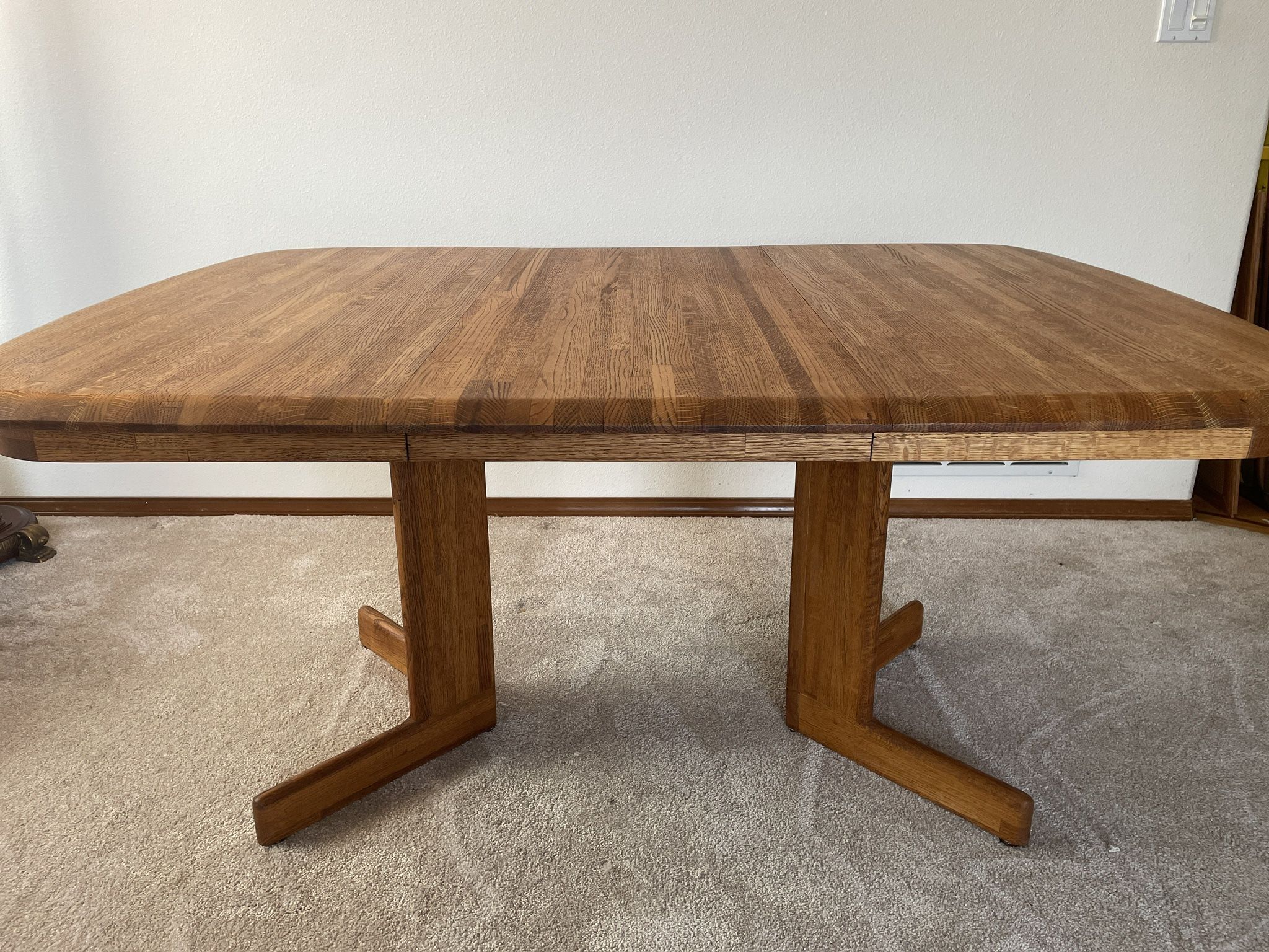 Oak table w/leaf & chairs Oak Table: 28” H x 42” D x 59”W w/ leaf W/out leaf 41”W One small water ring on table top (not very visible). Pick-up Lake Tapps/Driftwood Point