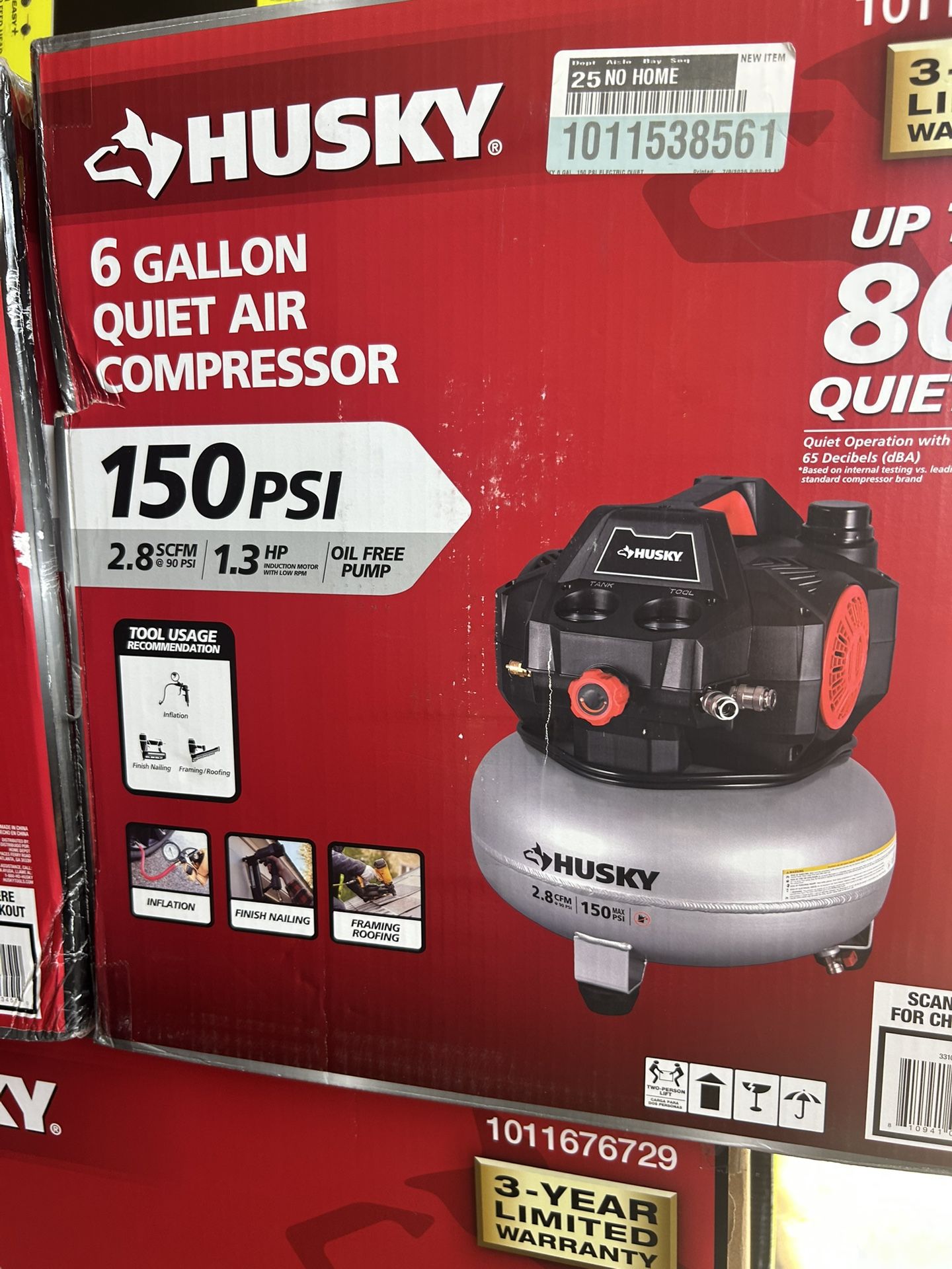 Husky 6 Gal. 150 PSI Portable Electric Oil-Free Quiet Jobsite Pancake Air Compressor with Aluminum Tank and 2-Quick Couplers ($140)