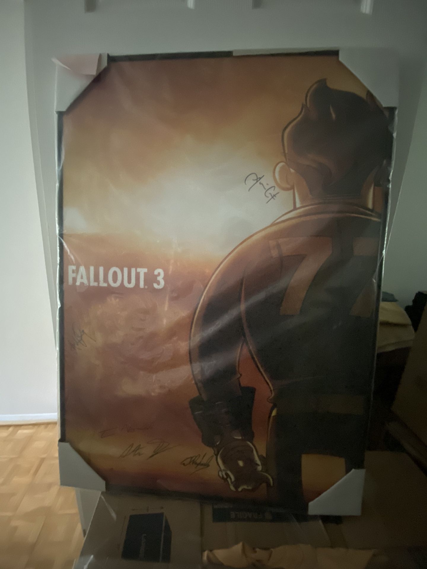 Fallout 3 signed in a frame . Hard , thick, and heavy . 32x22. The way women like it. This is was a gift (helped with the game) but I’m moving and some things need to go