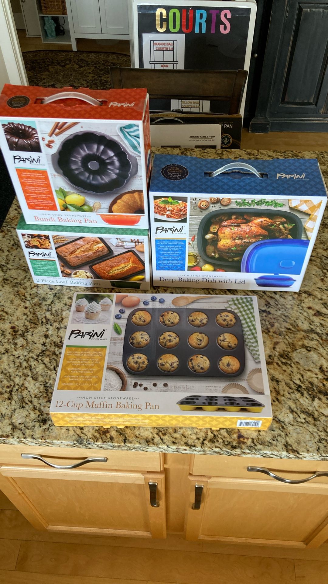 Bundt baking pan, two piece loaf, baking pans, deep baking dish with lid and 12 cup muffin, baking pan. All new boxes never opened.