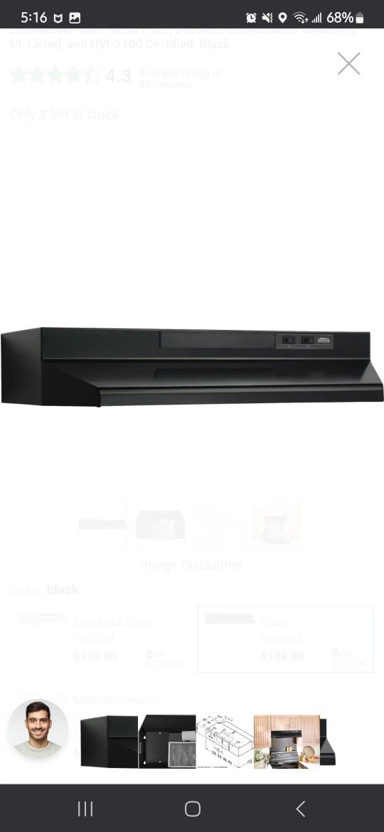 Broan F40000 Series F403023 30 Inch Under Cabinet Range Hood with 2-Speed/190 CFM Blower, Rocker Switch Control, Incandescent Lighting, Dishwasher-Safe Mesh Filter, Ductless Recirculation Capability, UL Listed, and HVI-2100 Certified: Black Msrp $99