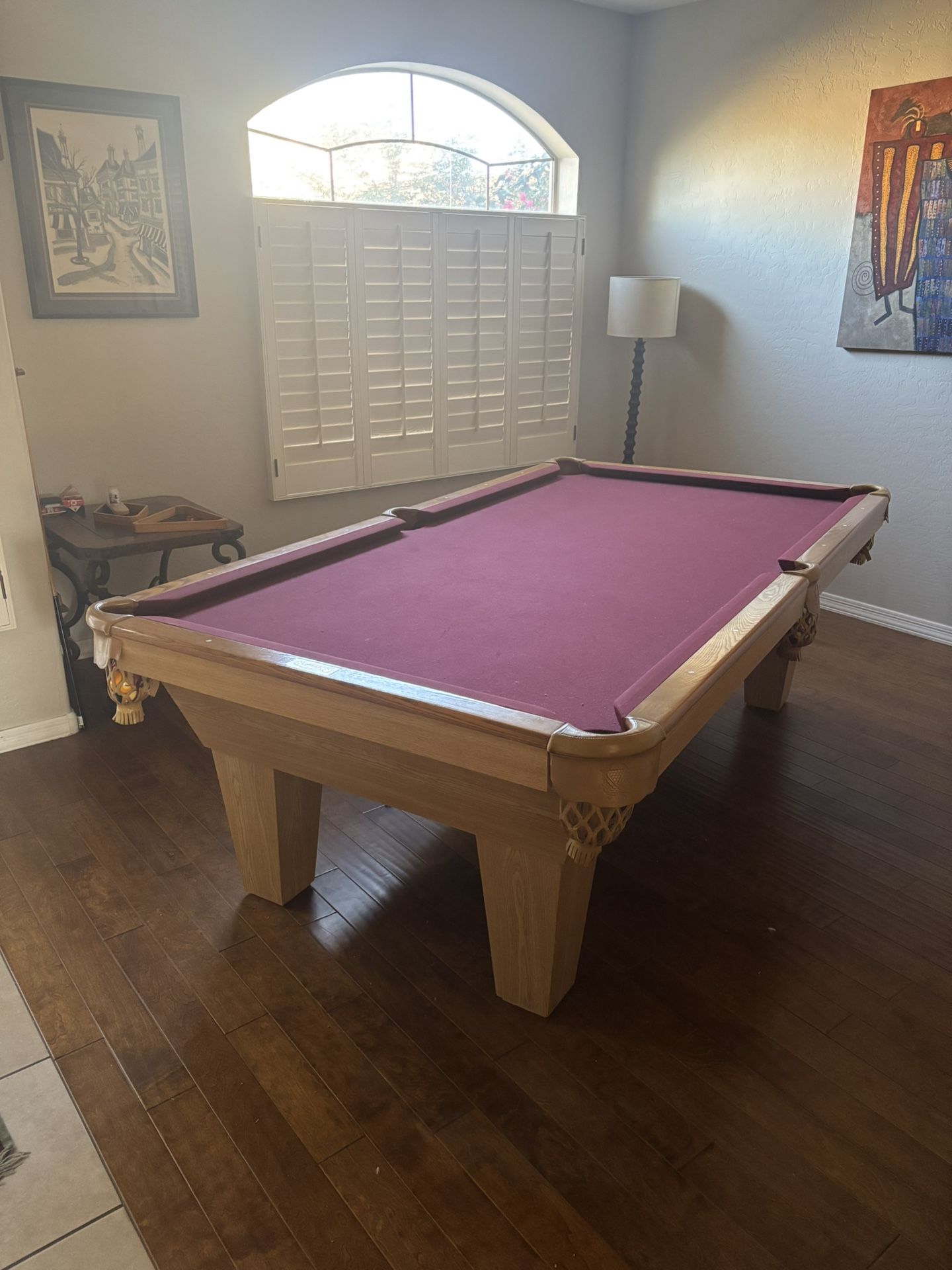 🎱 8 Ft Connelly Pool Table – Burgundy Felt – Free Installation! Upgrade your game room with this 8-foot Connelly pool table featuring rich burgundy felt. Table is in excellent condition and includes everything you need to start playing right away. Included: • Full set of pool balls • Cues • Triangle rack • Chalk & other essentials 🚚 Free professional delivery and installation—your table will be leveled and ready to play. Message me to schedule a viewing or reserve it today! 🎱
