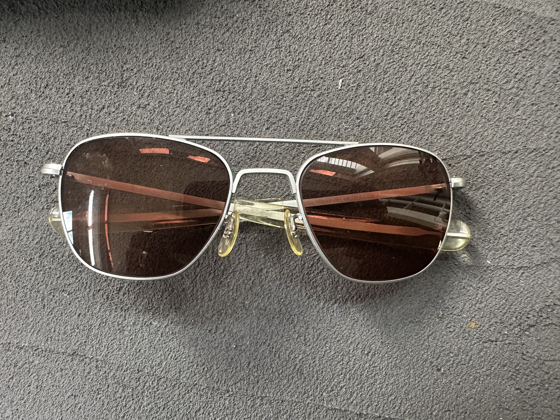 Gun mental great military issue 1970s Randolph Engineering aviator sunglasses. They have the original case and info card of the officer that owned them. Currently have prescription lenses in them. Perfect for putting shaded lenses in and having awesome vintage aviator sunglasses. Bridge pieces and bayonet pieces in good shape.