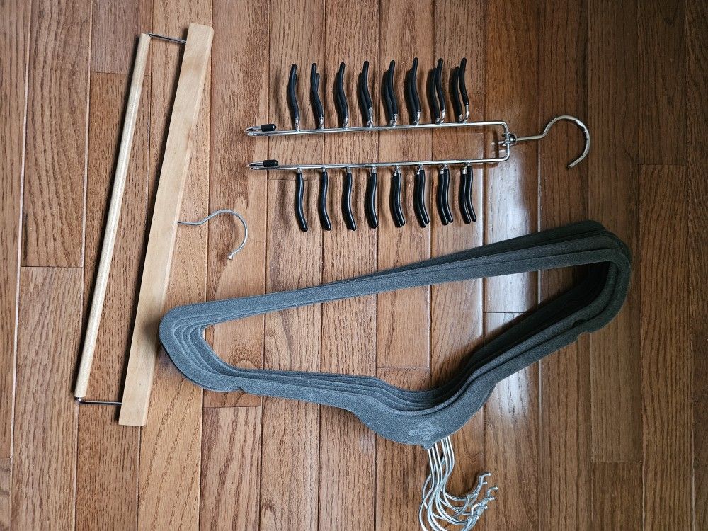 10 - velvet non slip hangers. 1- wooden pant hanger. 1- silver metal non slip tie & belt hamger. All for $10. Very good condition. Smoke/pet free home. Cash only. Pick up in Sykesville.