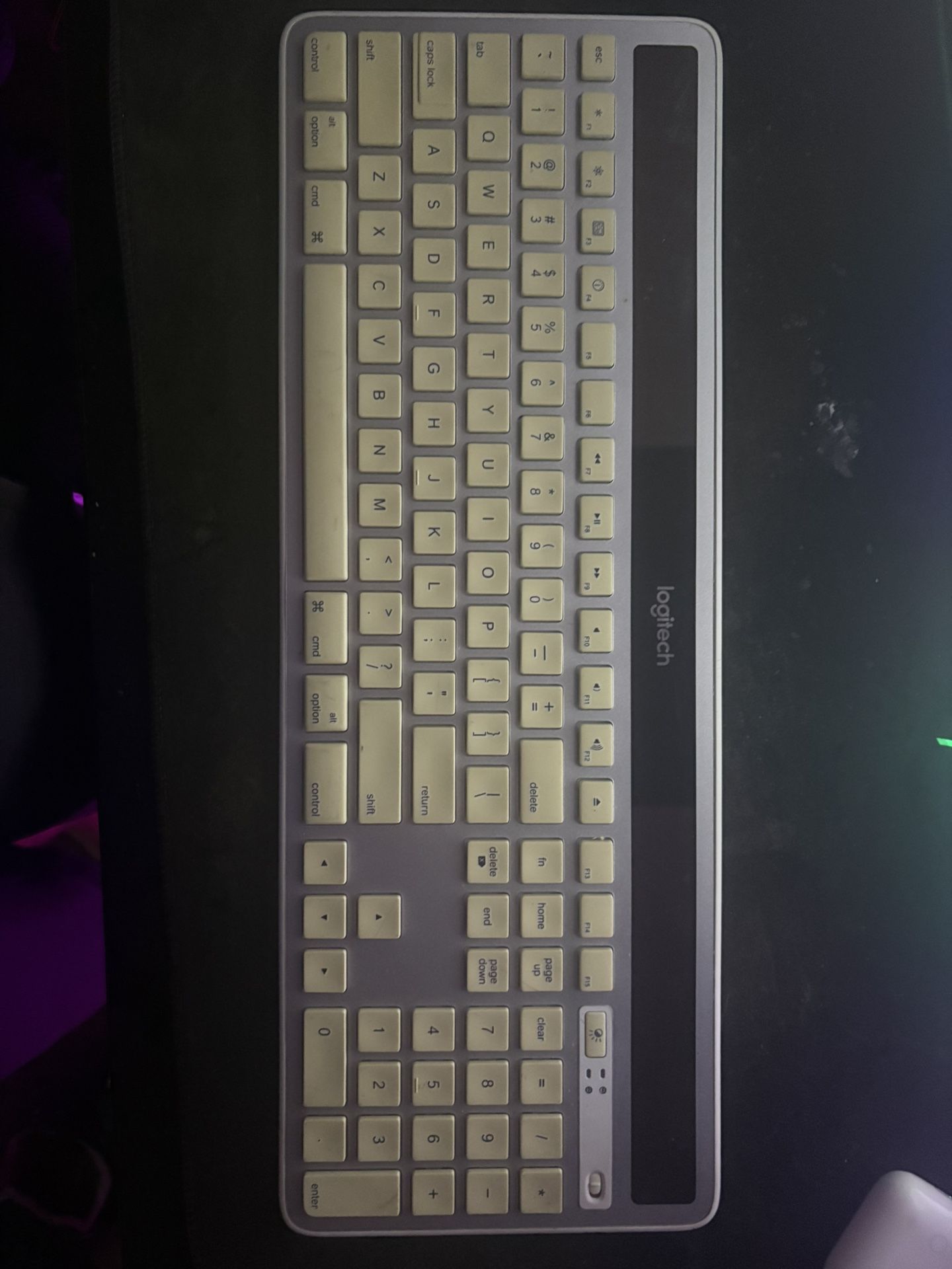 It is powered by indoor or outdoor light, eliminating the need for battery replacements. The keyboard features an ultra-thin design, measuring only one-third of an inch thick. It uses a tiny Logitech Unifying receiver for a reliable 2.4 GHz wireless connection. The keyboard has a familiar Mac layout with concave keycaps designed for comfortable typing. A full charge can keep the keyboard running for at least three months in total darkness - send offers lmk