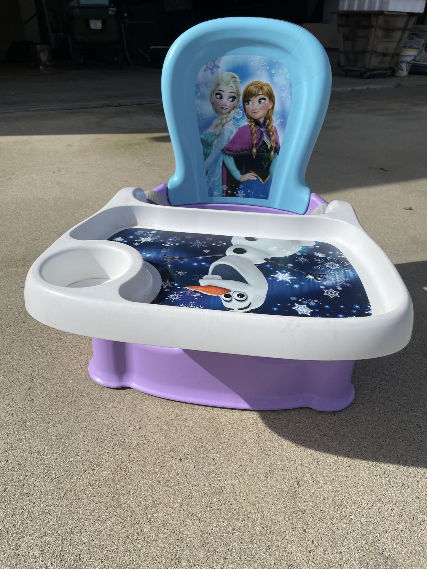 Does NOT have straps to attach to chair. Works great on the floor for your little one to practice eating.
