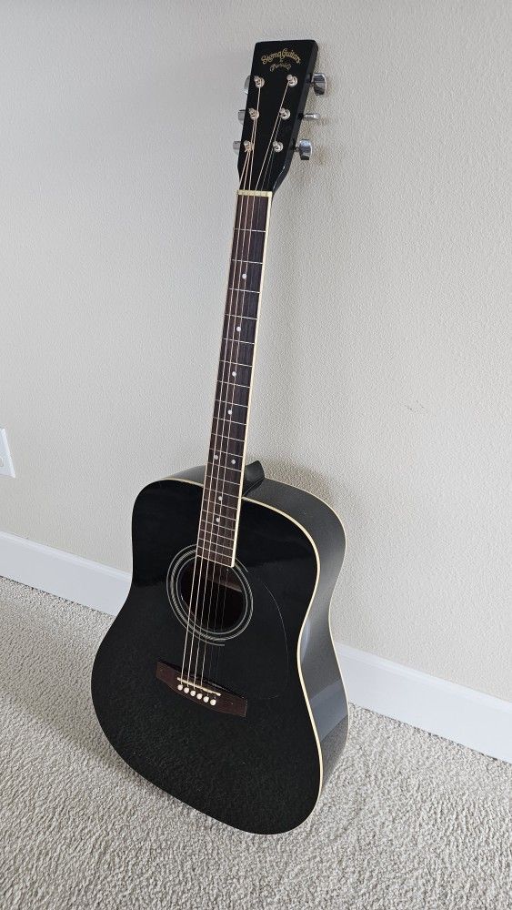 This guitar has been sitting in my closet for a while and I haven't really been playing Black acoustic guitar by Sigma Guitars It has some minor cosmetic damage If you have any questions, just shoot me a message I'm not firm on the price