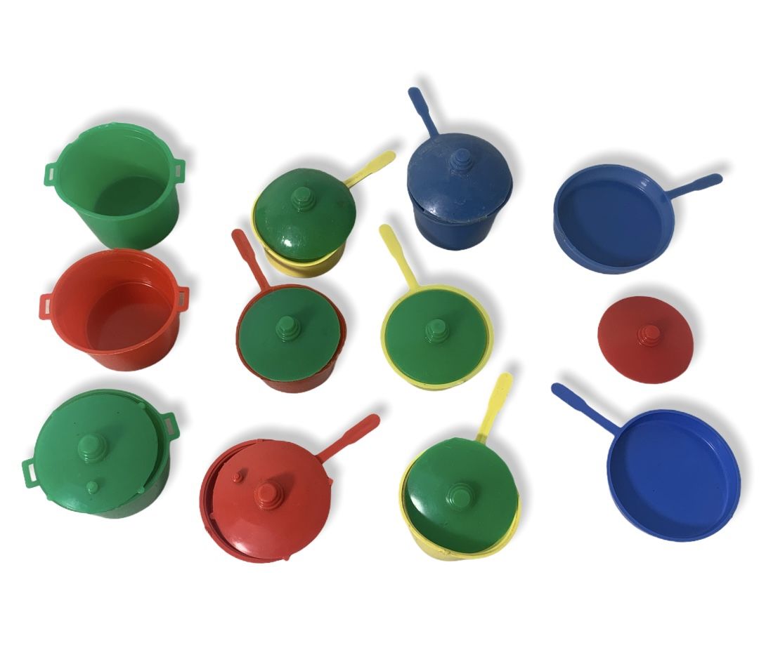 1950's 19 piece, plastic pots and pans by WANNATOYS REG. pots are marked. 8 pieces with handles. 3 pots without handles that look like boiling pots. 8 lids. Size most about 1" high. Colorful lot primary colors of red, blue, yellow and green. Condition: Nice collection of vintage, pre-owned, play wear. Some pots are warped. Most lids do not fit tight. Thank You for shopping with us.