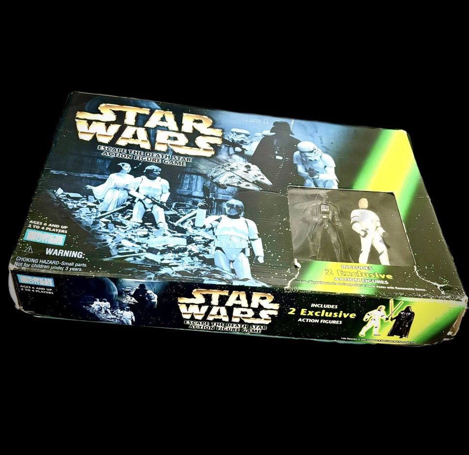 PreLoved Vintage Star Wars Escape The Death Star Action Figure Game 1998 Lucas Films Parker Brothers Boardgame with Original 2 Exclusive Action Figures Luke Skywalker in Trash Compactor and Darth Vader with Removable Dome in good vintage used lightly played condition with normal signs of aging- box has cosmetic flaws and I believe there is one missing weapon piece. Please see photos. Pick Up in Concord $20