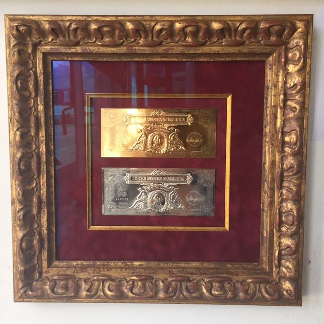 Gold and silver 2 dollar bills framed with fillet and velvet mat with gold frame ready to hang 18x18inch