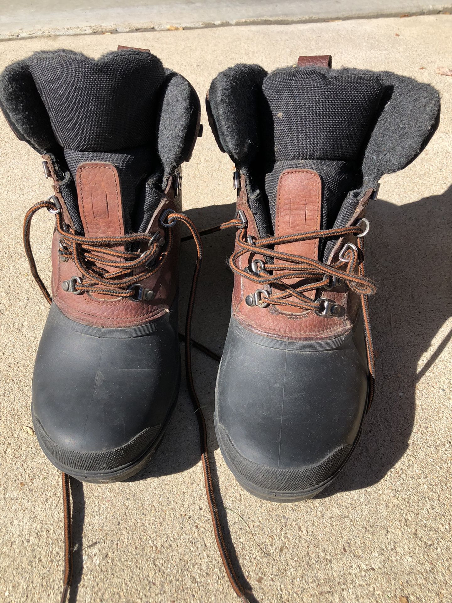 Various brands of men’s weather boots. All size 11. First pair (SOLD) is Donner Mountain, for $25. Second pair is Starker, for $8. Third pair is LL Bean, for $8.