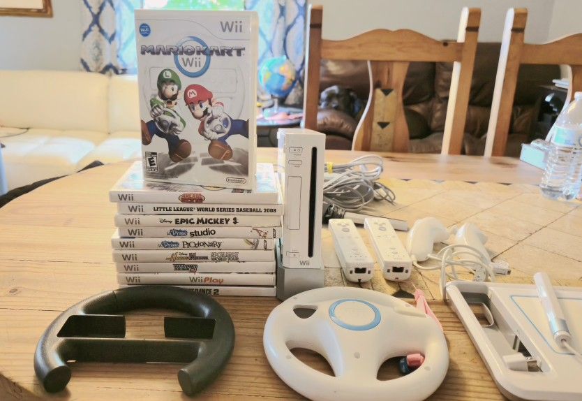 Nintendo Wii Console and Stand. Mario Kart 2 Mario racing Wheels 2 Wii Controllers 2 Nunchuck Controllers Udraw Tablet with 2 Udraw games 10 great games All attachments and sensor bar Everything Tested before I listed it and plays flawlessly.