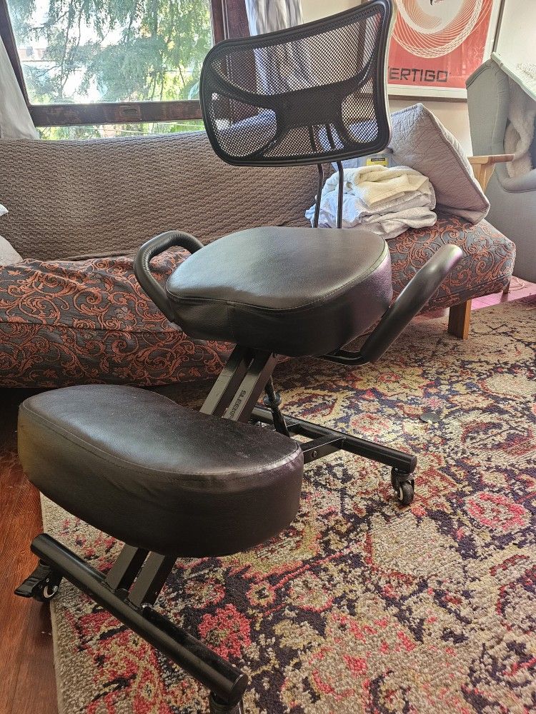 The Most Support. Unlike most kneeling chairs The Tokyo offers a flexible, mesh backrest that gives you more support than ever as your body adjusts to using a kneeling chair and your core begins to strengthen. The handle bars help give you keep you balance as you climb in and out of your chair. The Open Hip Angle Due to the angled placement of the seat cushion, when you place your weight onto your sit bones the chair gently tilts your pelvis forward encouraging a natural upright posture. This posture engages your core muscles eliminating pressure on your spinal discs, back and shoulders. What About My Knees? Don't be fooled by the term "kneeling chair". When sitting in the Tokyo the majority of your weight remains in your buttocks and any weight in your legs is placed on your shins. This allows you to be able to sit in this position all day long without any pain or discomfort in your knees. Key Features of The Tokyo: Backrest for added lumbar support Handles for added stability getting in and out of the chair. Open hip angle for effortless upright posture Weight capacity of up to 265 lbs Steel frame making it lightweight, strong and long-lasting. 4 inch thick cushions for added comfort and stability of recycled foam Height adjustability from 19" to 26" Natural, effortless S curve for your back to help with pain Works perfectly - just traded for one without handles