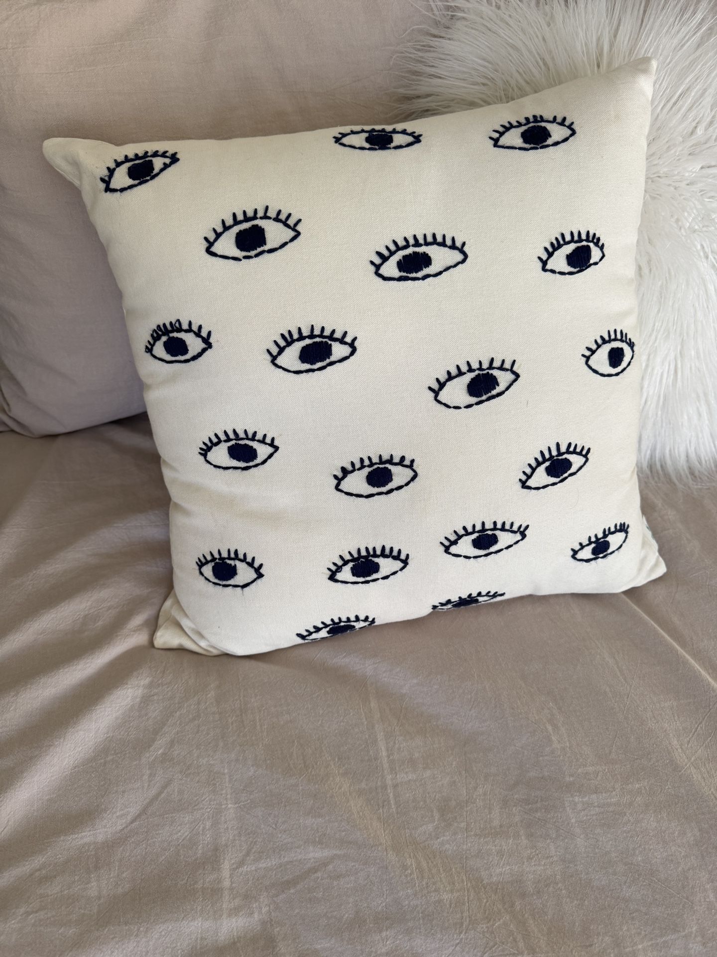 Urban Outfitters Eye Pillow Navy stitching on neutral background Beautiful detail…unlike dupes with cheap printed pattern Fun and quirky to liven up your space Zipper closure Measures approximately 18” x 18” without insert Closer to 16”x16” with insert Insert not included