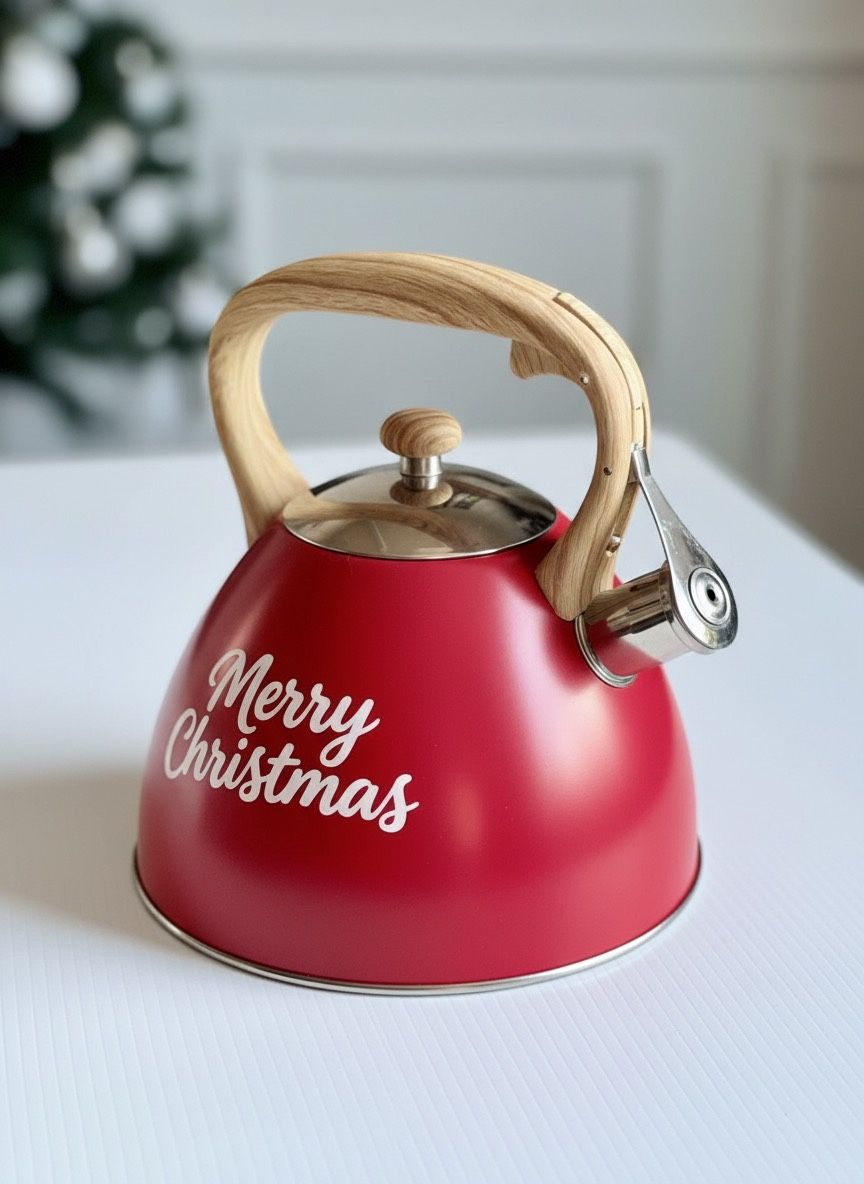 Festive red tea kettle with 'Merry Christmas' text. Features a wooden handle and stainless steel spout. Celebrate the season with this beautiful holiday tea kettle from Well Equipped Kitchen. Finished in festive red with “Merry Christmas” lettering, this kettle features a natural wood handle and matching lid knob for a warm, classic look. Details & Features • Brand: Well Equipped Kitchen • Capacity: 2.7 QT (approx. 2.6 L per tag) • Material: Stainless steel • Color: Red with white “Merry Christmas” text • Handle: Smooth solid wood handle (closed style) • Spout: Whistling spout with flip lever • Stovetop Compatibility: ✔ Gas ✔ Electric ✔ Ceramic ✔ Induction compatible • Care: Hand wash recommended Condition • New with original tag attached • No dents, cracks, or damage noted • Please review all photos for exact condition and details Approximate Measurements (shown in photos) • Height: ~11 in • Diameter: ~8 in Perfect For • Christmas & holiday kitchen décor • Seasonal entertaining • A charming and practical holiday gift This kettle is both functional and decorative—a cozy statement piece for winter and holiday kitchens. Ships carefully packaged.