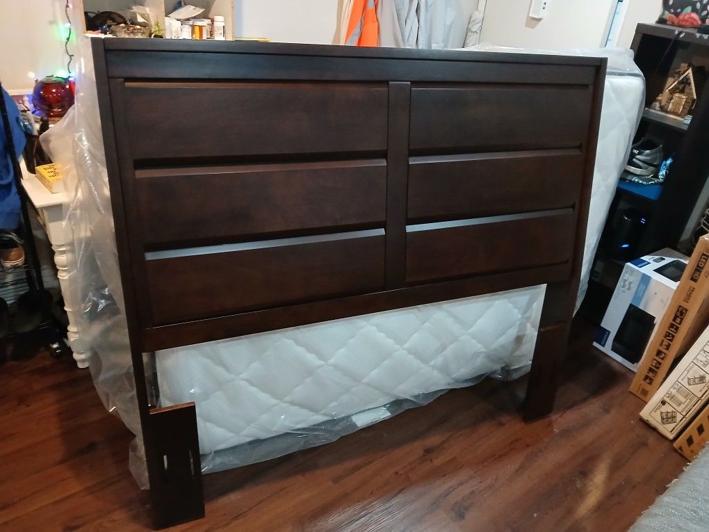 Brand new in box and plastic Full size mattress with headboard and bed frame plus hardware everything's brand new never used