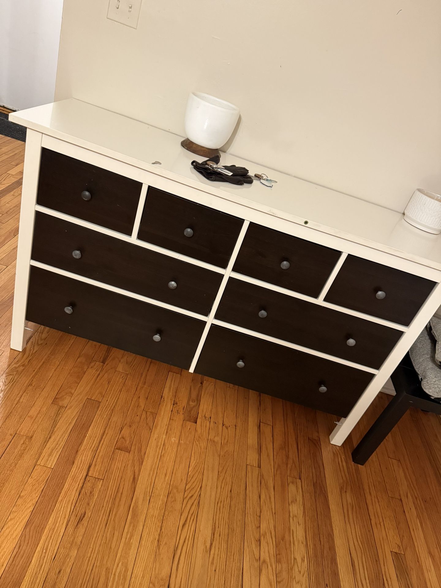 White Dresser With Brown Drawers. Assembly Not required. Perfect for a kids room or extra storage. Pickup only. Selling due to moving out. First c
