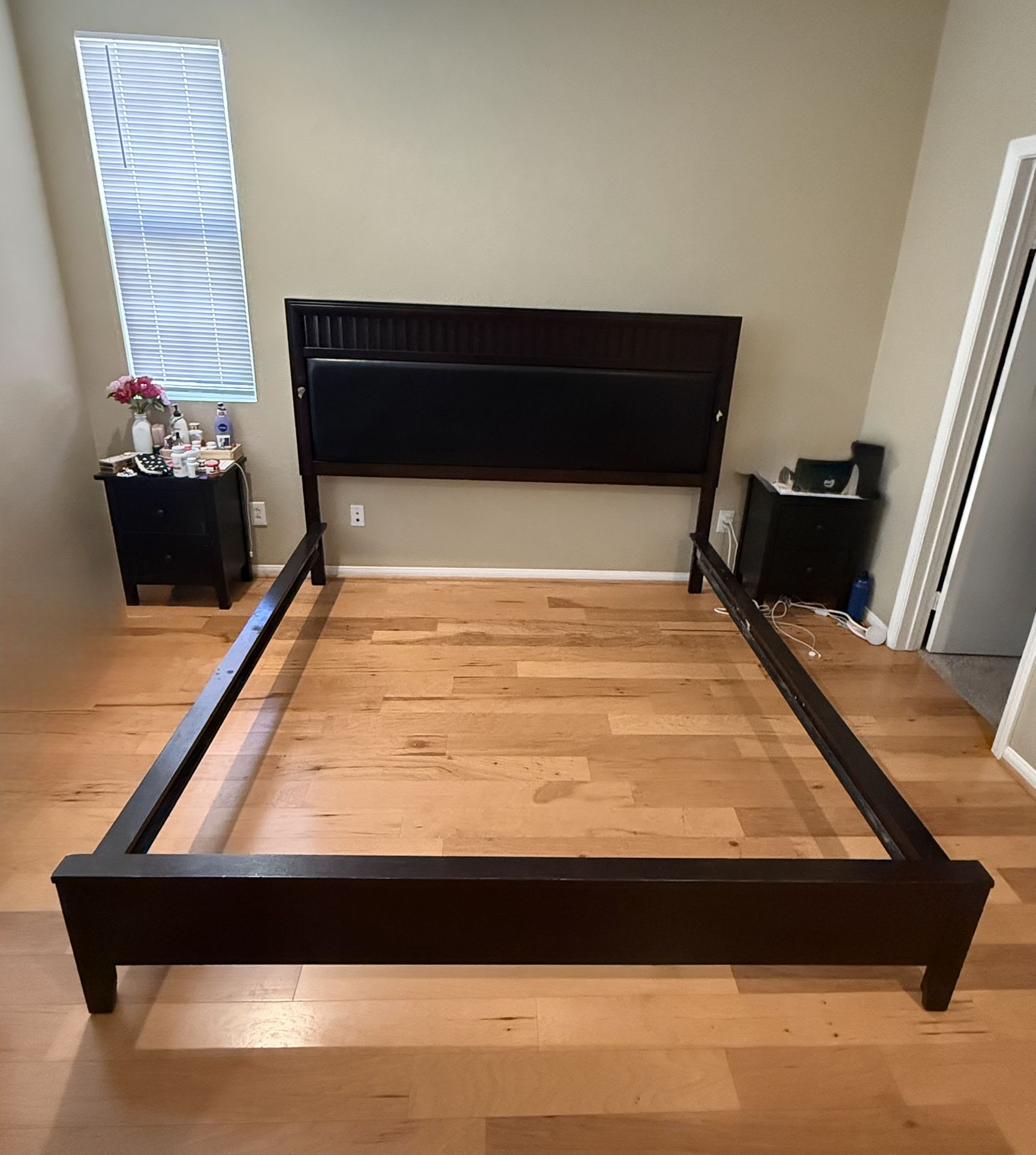 King size wooden bed frame in good condition. Sturdy and stylish dark wood design with headboard. Fits standard king mattress (mattress and base not included). Easy to assemble and very solid.