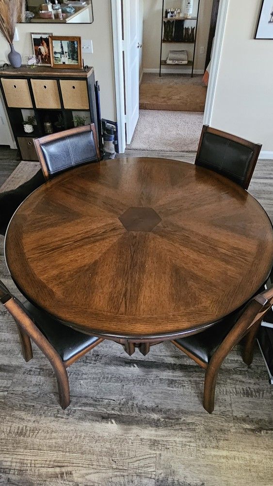 Table is 53 inches in diameter and 30 inches in height Chairs are 38 inches in height There are 4 bolts that allow the top to separate from the base for easy transportation The chair in the picture has a hole in the seat, the rest of the chairs are fine I 17&Dixeleta