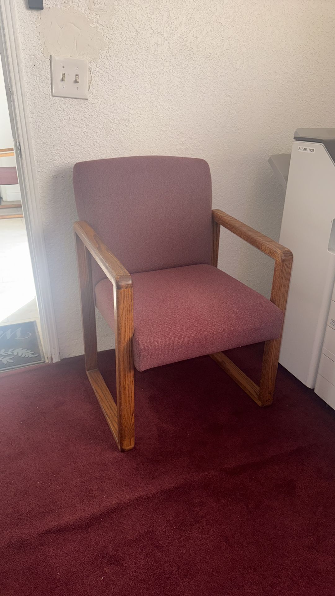 5 light red guest chair with a sturdy oak frame, commonly used in office waiting rooms or reception areas. Like new. Asking $10 each
