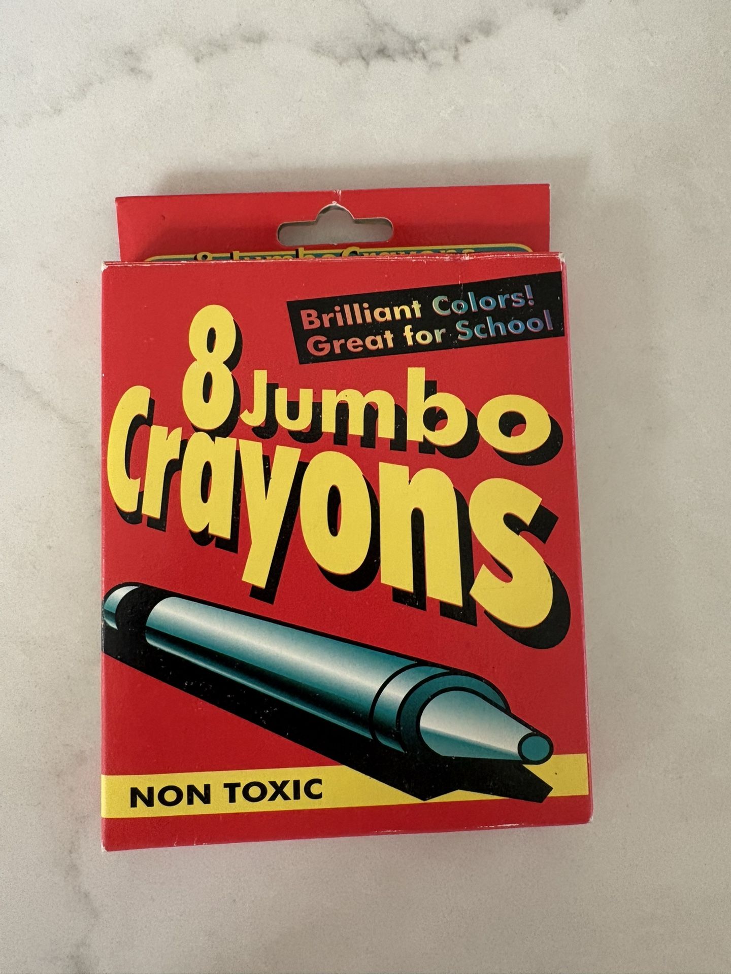 This is a box of Family Dollar 8 Jumbo Crayons. Quantity: 8 crayons Features: Brilliant Colors, Great for School, Non-Toxic Distributor: Family Dollar Services, Inc. Origin: Made in Indonesia Item #: 1302923