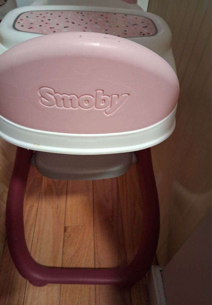 Pink and white doll high chair with pink and purple speckled dots on the tray.