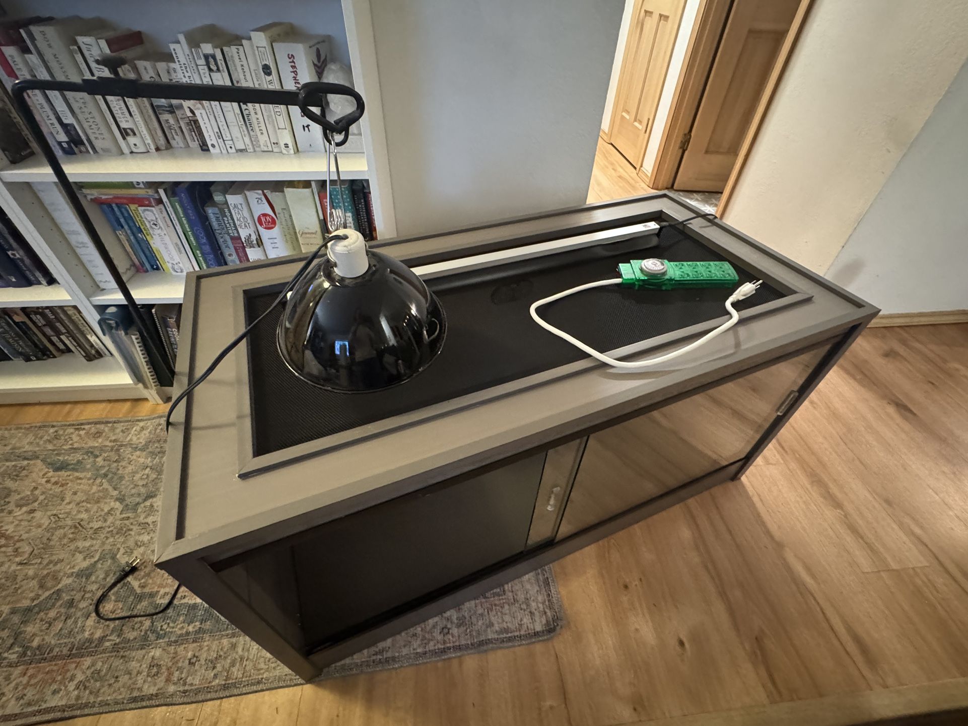 We moved our bearded dragon to a new tank and no longer need this one. Used, but cleaned out and in good condition. Sliding glass doors and metal mesh top. Also including heat lamp, UV fixture, and extension cord with timer. We also have some lizard hides that you’re welcome to have as well (not pictured).