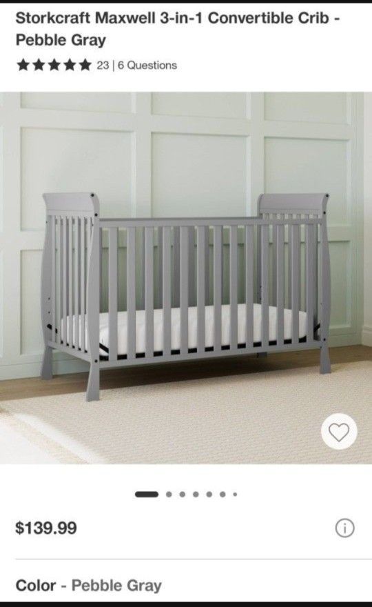 Brand new crib. Unopened box. Pebble gray. •3in1, as a standard crib, a sleigh bed, then a toddler bed •JPMA certified, Safety tested •Adjustable mattress base, 3 different heights( mattress not included) •Crib dimensions: W:56.14in, D:29.13, H:40.28, Weight:36.52 •Box dimensions: 58inL,32inH,5inD ( I purchased this, but then was gifted with another) Pick up in Chandler