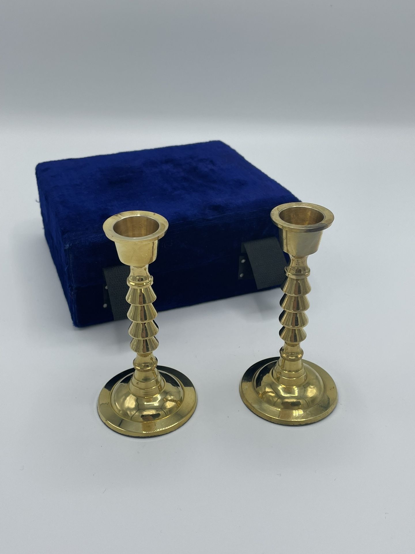 Pair of brass candle holders with blue storage box. 4” tall. Excellent condition! Gently used — with only very minimal tarnishing. Marked Alef Judaica (India)