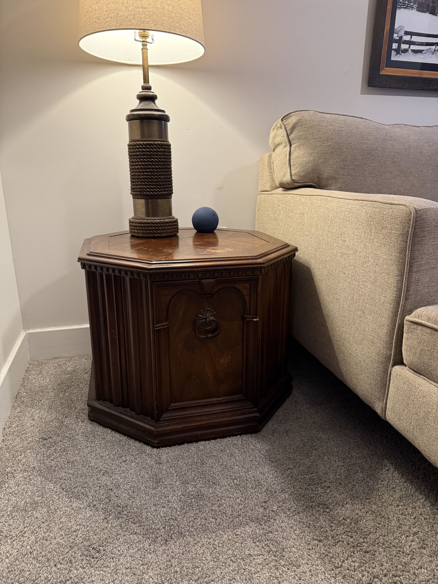 Beautiful matching pair of vintage octagonal end/side tables. Perfect beside a sofa, armchair, or in an entryway! Solid construction, sturdy, and in great shape. Features: • Rich dark wood finish with beautiful grain • Octagonal top • Decorative fluted sides and elegant molding • Functional storage cabinet with a single door and ornate brass ring pull • Plenty of room inside for remotes, books, coasters, etc. Local pickup only.