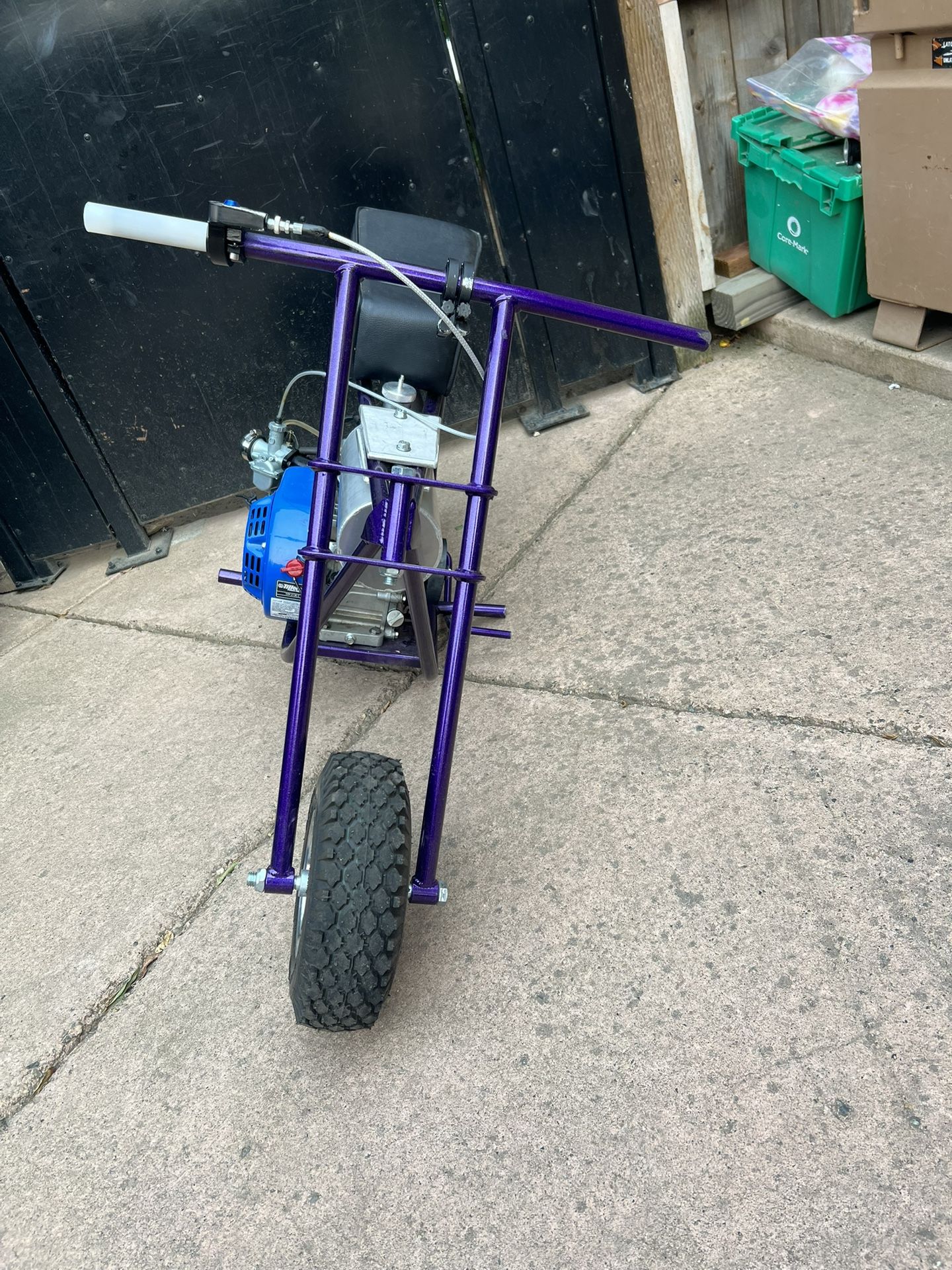 Comes with grips for throttle Few scratches Governor deleted with billets Upgraded carburetor Took off stock exhaust put GTS exhaust pipe Took off gas tank and put a 0.8 gallons aluminum gas tank Powder coated purple with sparkles New oil Runs good Able to negotiate