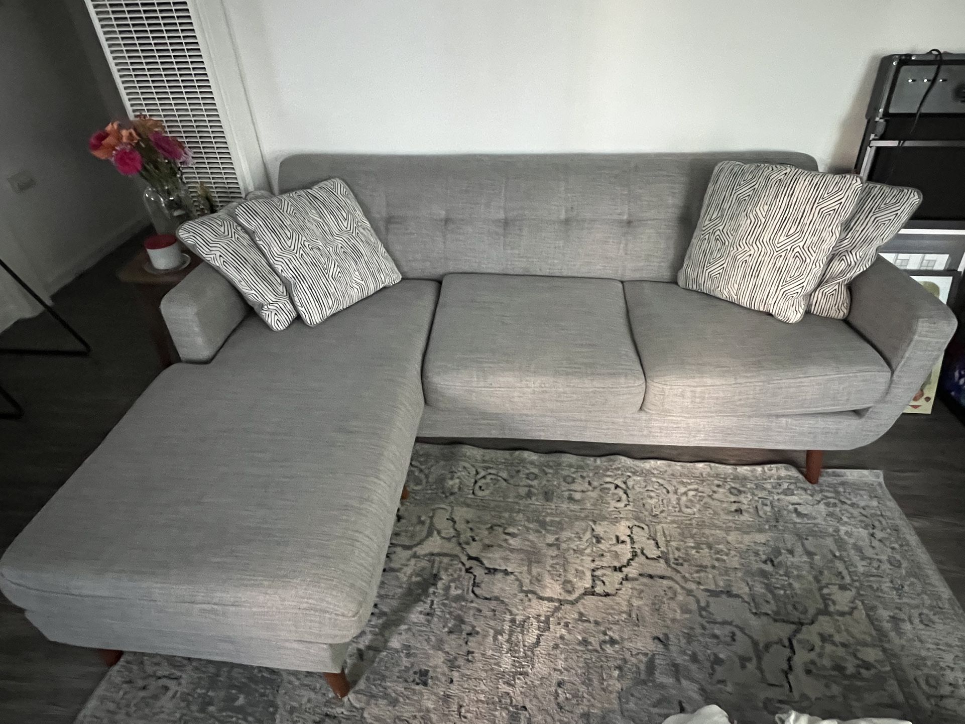 Modern gray L-shaped sectional sofa with chaise in very good condition. Comfortable, supportive cushions and a clean, neutral look that fits easily into most living spaces. The chaise provides extra lounging space and can seat multiple people comfortably. Includes an extra third cushion that can be used to replace the chaise cushion, allowing you to change the layout or refresh the seating area as needed. No rips, stains, or odors. From a smoke-free home. Includes accent pillows shown in photos. Selling due to rearranging furniture.