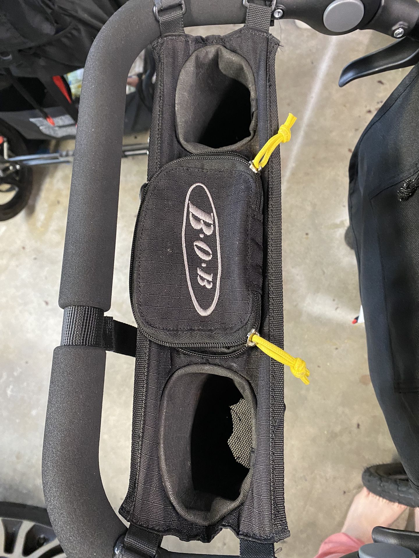 Stroller caddy! Older version of Bob single stroller caddy (but would work on any stroller, as it just double velcros on). 2 drink holders. Note: does NOT fit wide based water bottle. Has a little zipper compartment for keys, card, etc. $10 pickup in Maple Valley. Good used condition. Sturdy, durable. Lots of life left if you need a few extra holders on your stroller.