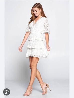 Beautiful white lace mini dress π€ Super feminine and elegant, perfect for brunch, garden parties, bridal showers or special occasions. Features a flattering V-neck, delicate lace details, and a flowy tiered skirt that moves beautifully. Worn once β like new condition β¨ Size Medium Pick up in La Mesa π« From a clean, smoke-free home