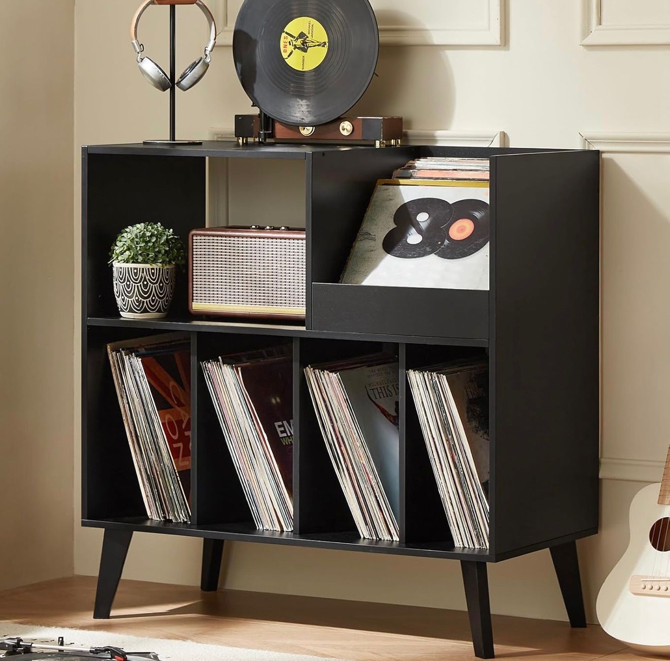 Large Record Player Stand with Storage, Retro Black Turntable Table for Music Room or Living Room, Holds Up to 300 Vinyl Albums with Display Shelf