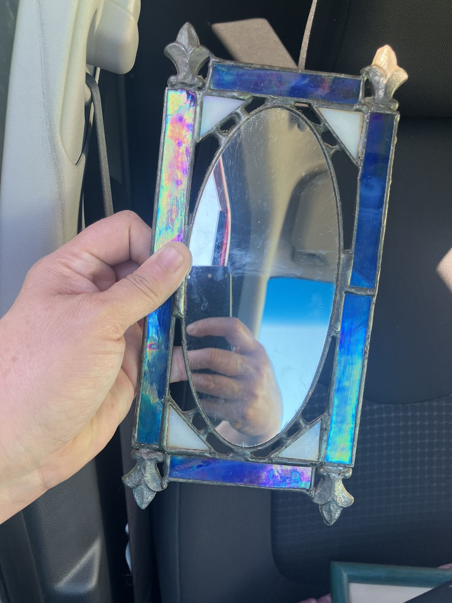 small, rectangular stained glass mirror with a blue, white, and iridescent/faceted glass border, made in Boothbay Harbor, Maine.