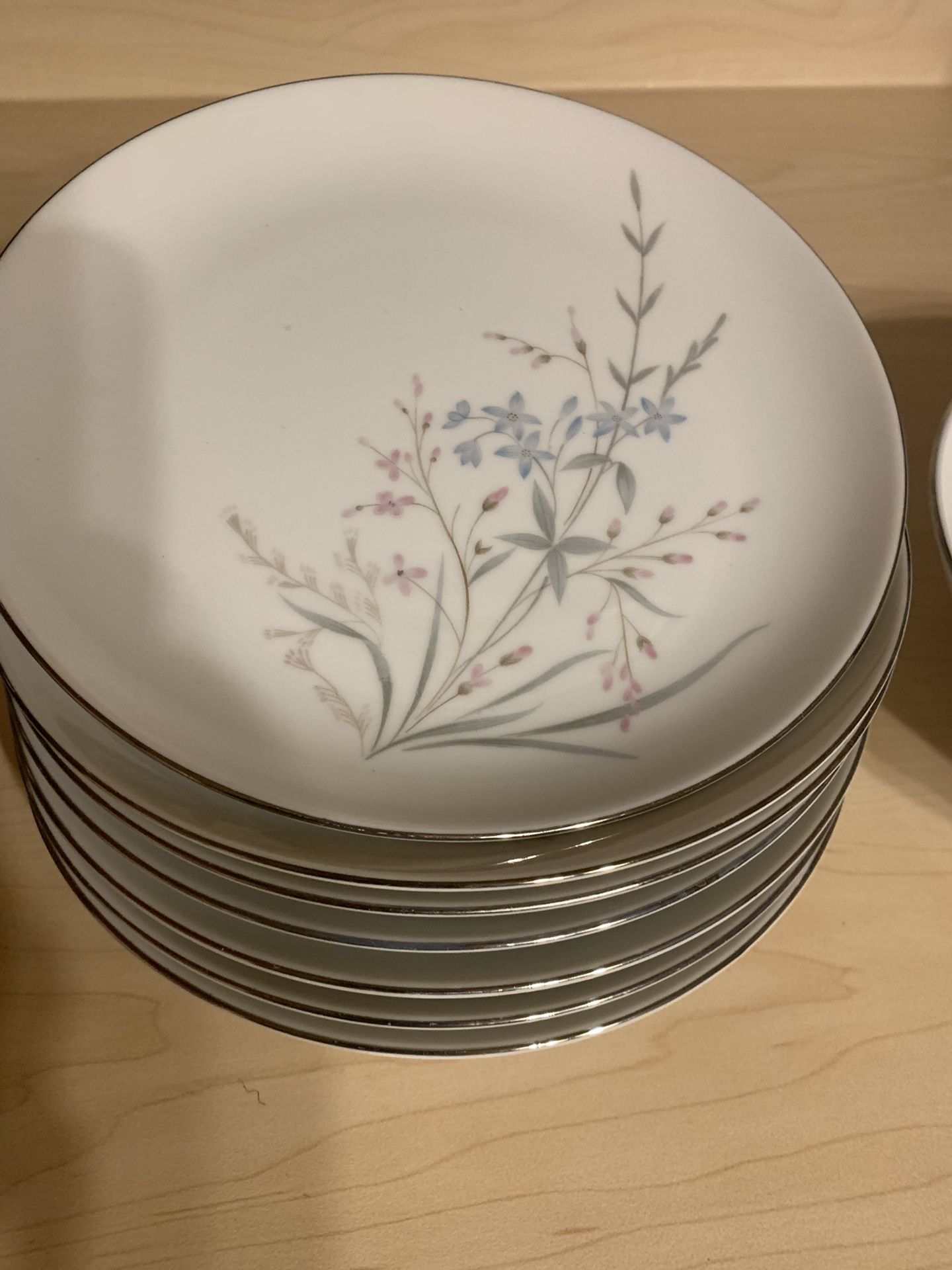 Beautiful Royal M By Mita. Silver lining, dainty blue and pink flowers. Would be perfect for a china hunch! Located in queen creek. 8-small sized plates 8-medium sized plates 1-large bowl I want to keep as a set. Make me an offer, need gone ASAP!